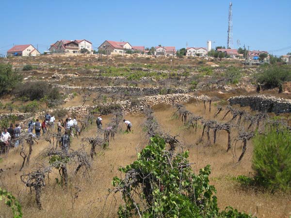Tentative de maigre récolte avant l'intervention des soldats. Derrière, les maisons des colons israéliens - région de Bethléem