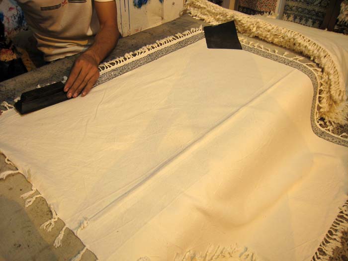 Fabrication des tentures traditionelles avec des tampons encrés ; bazar d'Ispahan