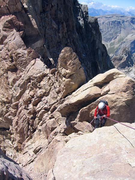 Rappel depuis le sommet oriental, au-dessus du gendarme le séparant du sommet occidental