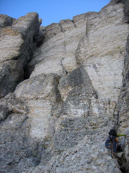 Petits pas de grimpe facile pour rejoindre la vire supérieure