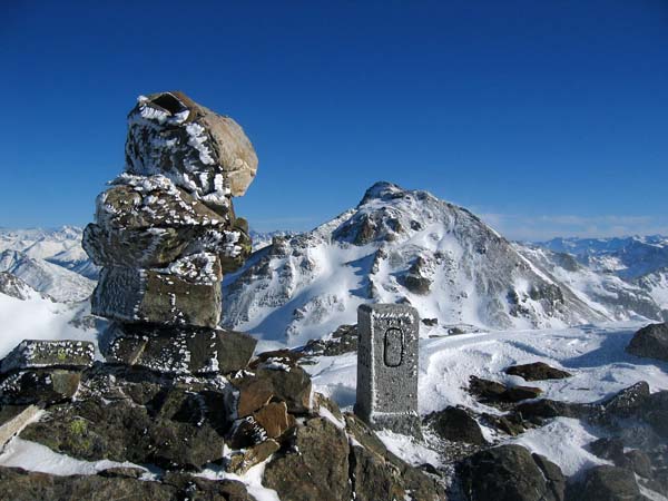 Cairn au sommet du Piz Faschalba ; au fond, le Piz Tasna