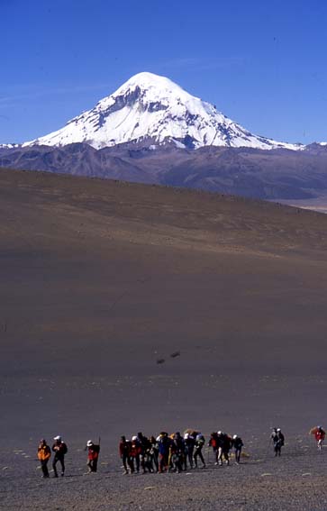 Marche d'approche vers le camp de base du Parinacota ; au fond le Sajama (6542 m)