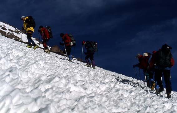 Tentative pour le sommet, progression au milieu des pénitents du Parinacota