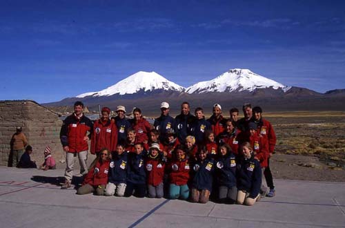 L'équipe "Bolivie 2001" et les volcans Parinacota et Pomerape - Village de Sajama