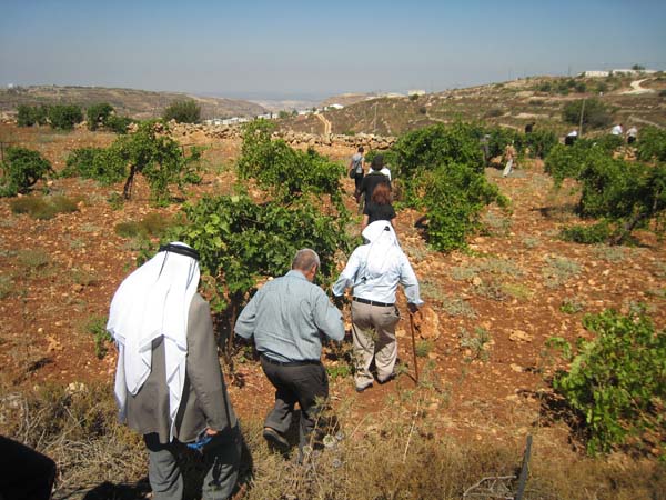 Retour dans les vignes après des années d'absence. Au fond, les maisons des colons israéliens - région de Bethléem