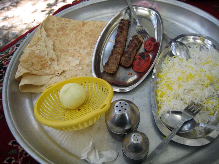 L'incontournable repas des Iraniens : brochette kebab, riz nature et safrané, nun, tomates et oignon