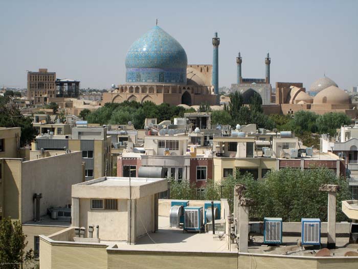 Les mosquées bleues d'Ispahan vues depuis une terrasse d'hôtel