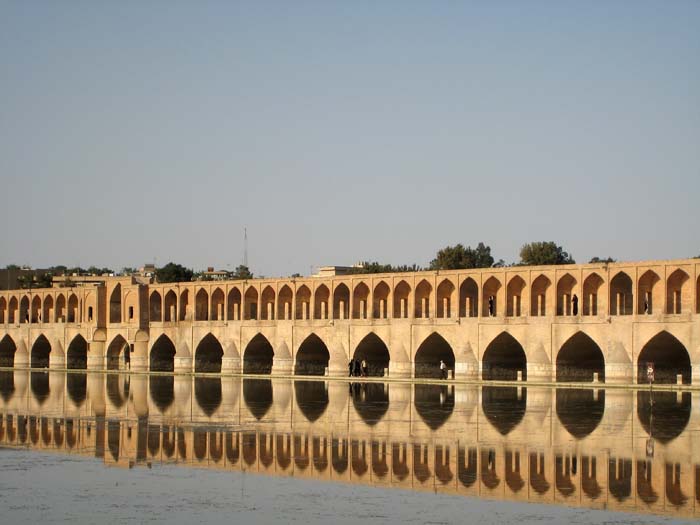 Le pont Si-o-Seh vu de la rive opposée. L'eau est au plus bas, résultat d'une importante sécheresse ; Ispahan