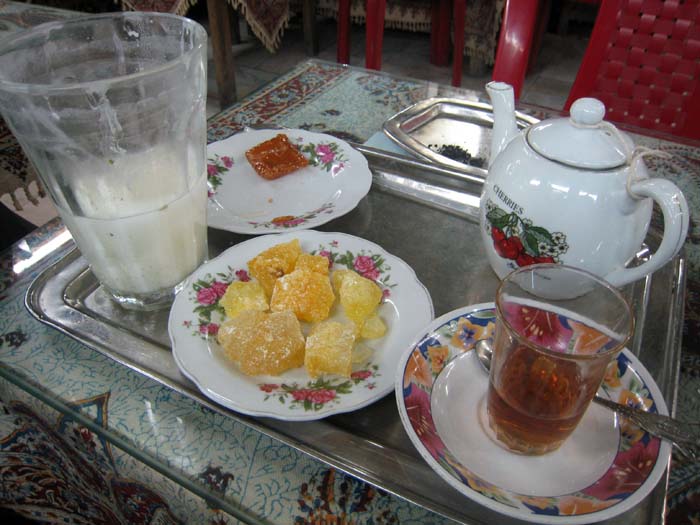 Le "goûter"des maisons de thé : le "dugh", boisson à base de lait fermenté et de yaourt, ou le thé, accompagnés de pâtisseries et de cristaux de sucre ; Ispahan