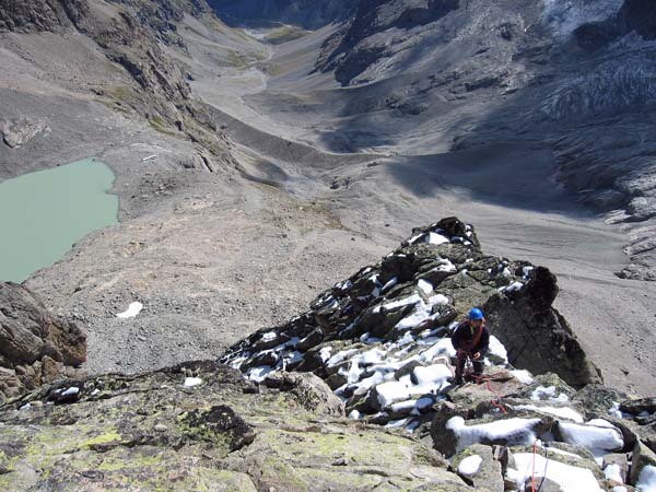 Dernière longueur sous le sommet de la pointe Emma, dominant le lac et refuge du Pavé