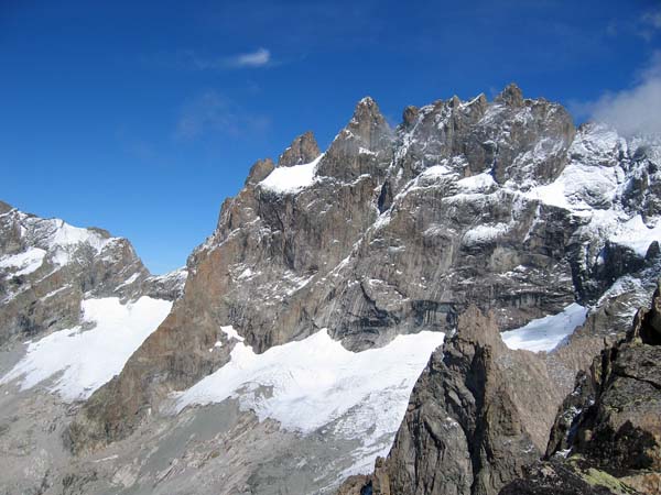 Vue du sommet sur le glacier Carré et la face sud de la Meije