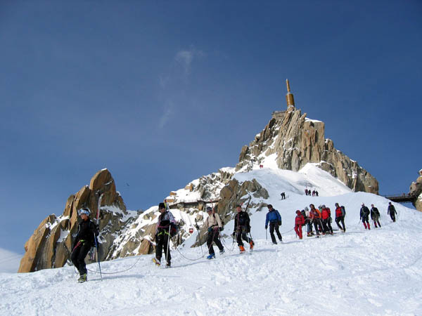 Une cordée du DSA descendant l'arête déséquipée de l'Aiguille du Midi