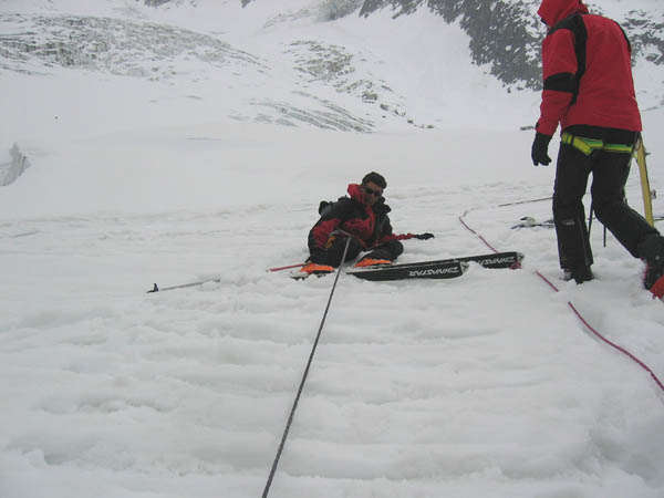 Le skieur amont enraye la chute du skieur aval dans une crevasse